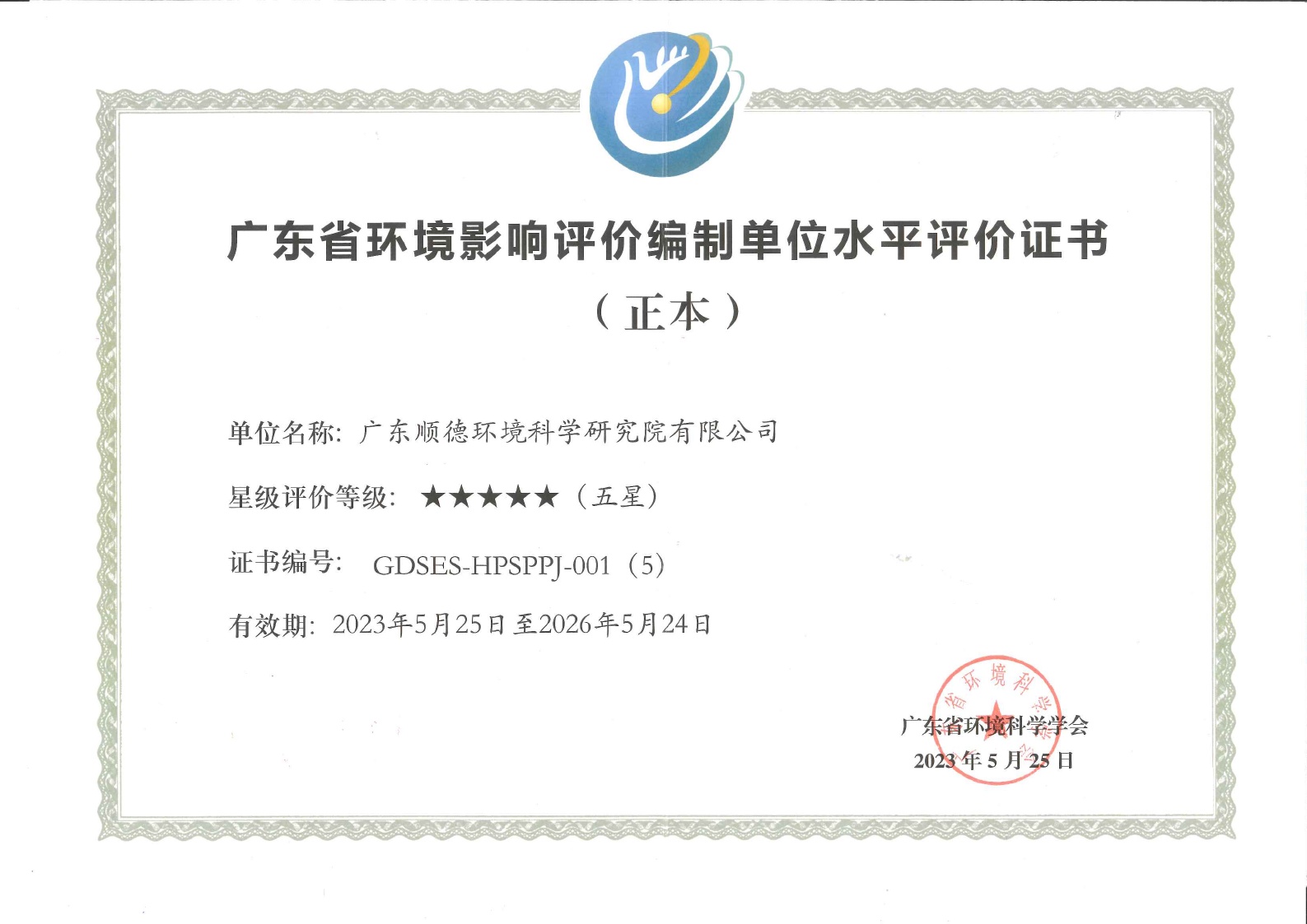 廣東省環境影響評價編制單位水平評價五星單位證書